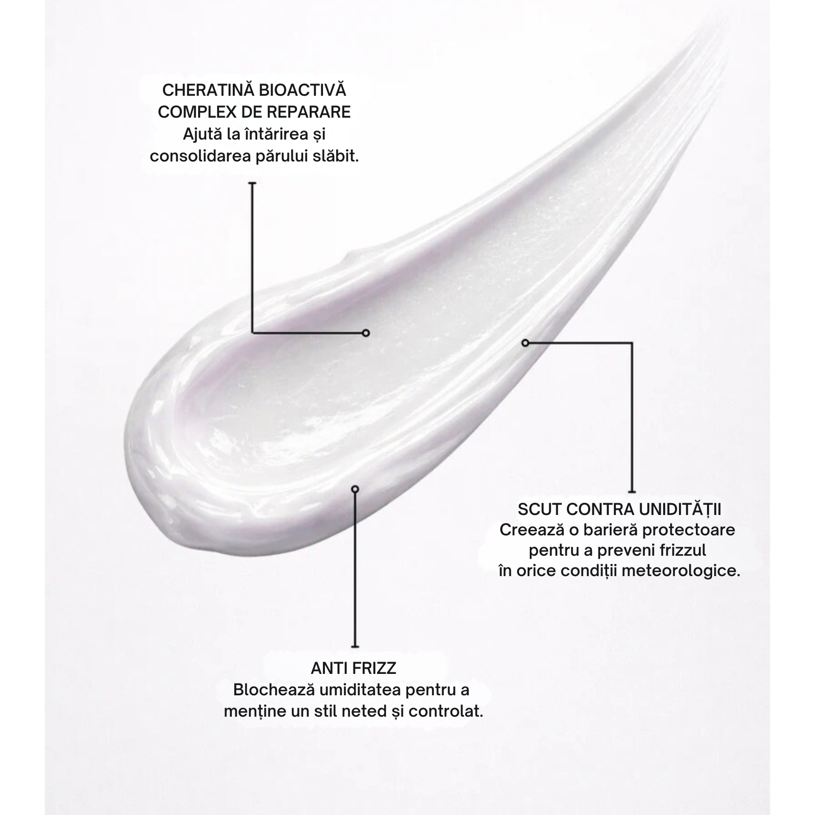 - Elimină frizzul și blochează umiditatea.